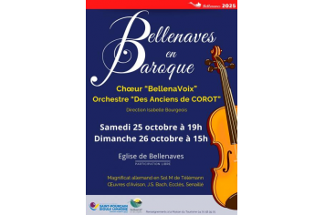 Concert Bellenaves en Baroque Du 25 Octobre 2025 au 26 Octobre 2025 Le choeur "BellenaVoix" et l'orchestre "Des Anciens de COROT", dirigés par Isabelle Bourgeois, vous présenteront le Magnificat de Téllémann et oeuvres de Ecclès, Senaillé, Avison... Samedi 25 octobre 2025 à 19h. Dimanche 26 octobre 2025 à 15h. A l'église de Bellenaves. Participation libre. Plus d'infos